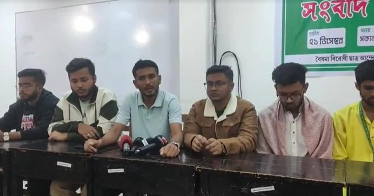 শনিবার (২১ ডিসেম্বর) দুপুরে বিশ্ববিদ্যালয়ের জিইসি ক্যাম্পাসে ‘বৈষম্যবিরোধী ছাত্র আন্দোলন’ এর ব্যানারে এক সংবাদ সম্মেলনে শিক্ষার্থীরা এ ঘোষণা দেন।